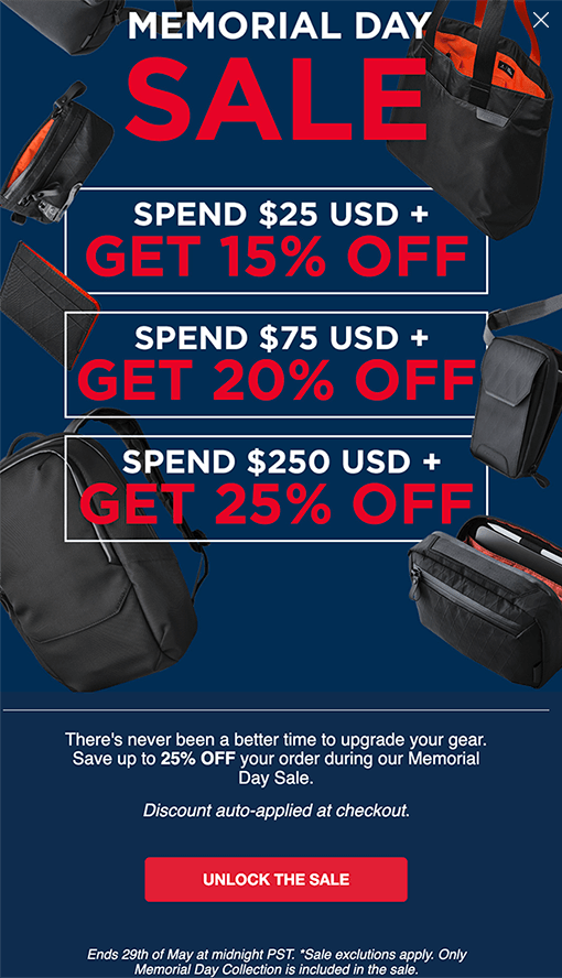 When crafting your campaign, establish a specific timeframe for your promotions and communicate that in your copy or design elements using countdown or waterfall timers. Be sure to emphasize savings, exclusive access, or unique incentives to increase the perceived value of the promotion.