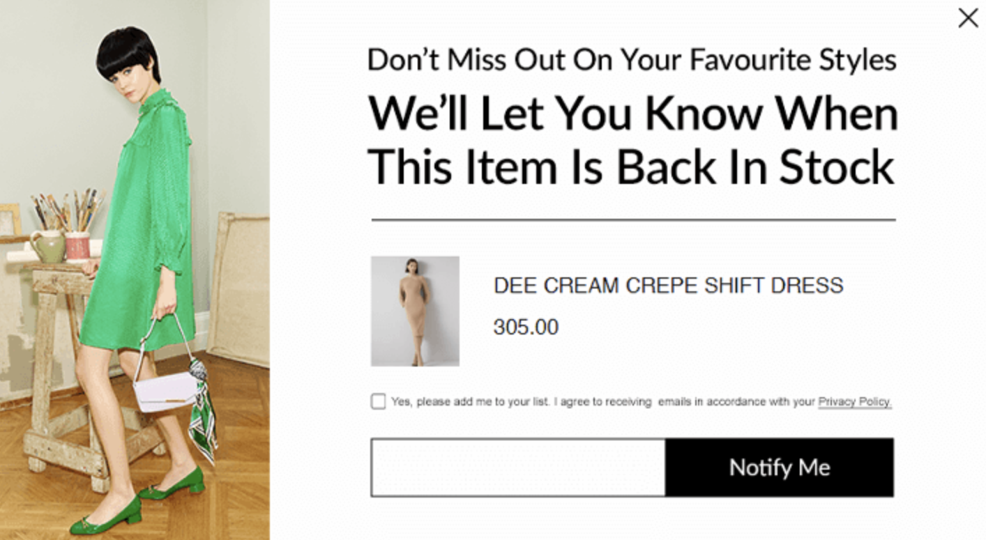 - Email Marketing: Fashion is a competitive landscape, and keeping your brand top-of-mind is key. Thankfully, Email Marketing can do so much more than just bring back an abandoned customer. Whatever message you want to communicate with your email list, Upsellit has you covered. Turn out-of-stock inventory into a remarketing opportunity with Availability Alerts, cater to price-sensitive shoppers by allowing them to opt-in to real-time price drop alerts for specific products, and so much more.