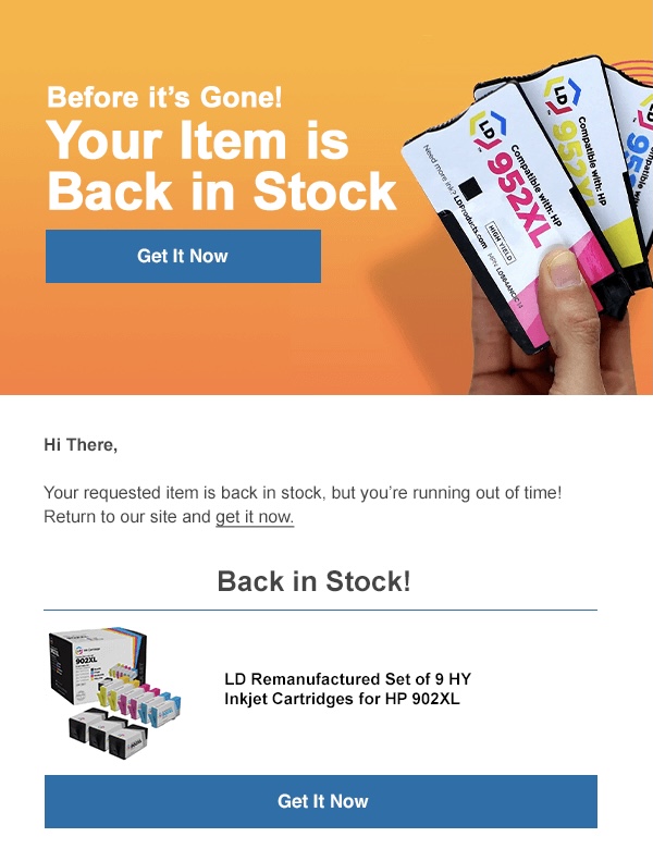 Once the product is back in stock, send an email immediately so they have a fair chance of getting the item. This is where a strategic email design comes into play to ensure the shopper’s interest is reignited and they return to your website to make a purchase.