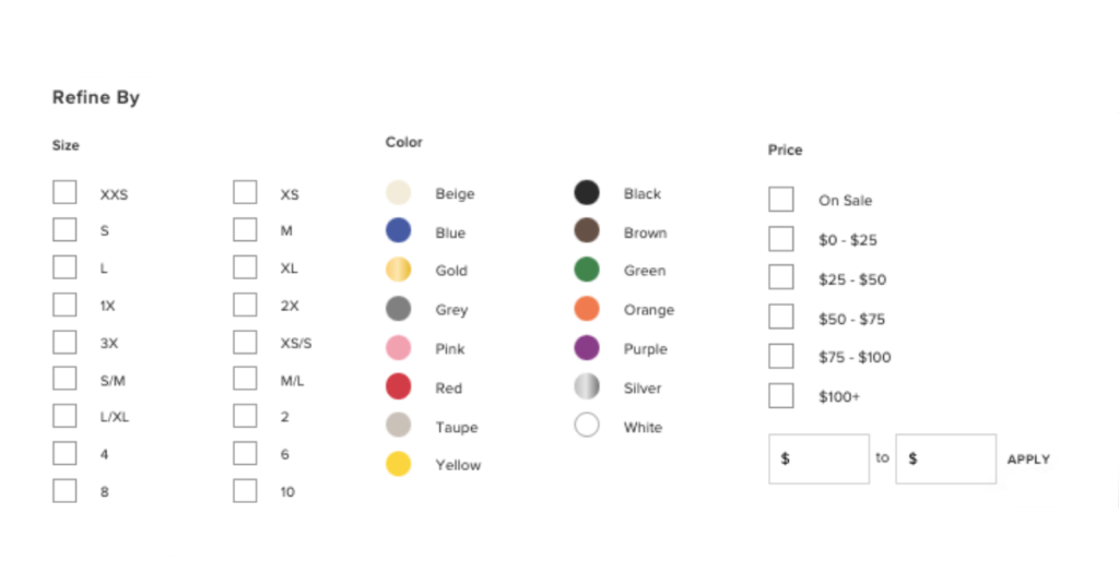 Even if a shopper is viewing their desired category, let them filter by size, color, price, or specific features so they see what’s relevant to them. This eliminates the need to click through similar products until they find the right match.