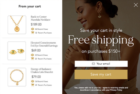 Cart Preservers are also a leading email personalization strategy that creates a seamless path back to your website after a shopper has left. Once a user goes to abandon your website, offer to save their cart in exchange for an email so you can send them their items in consideration.