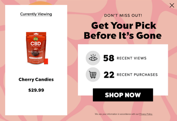 You can also utilize social proof to validate these real time recommendations by showing recent product views and purchases on a specific item so shoppers know their item is popular and it’s time to buy.